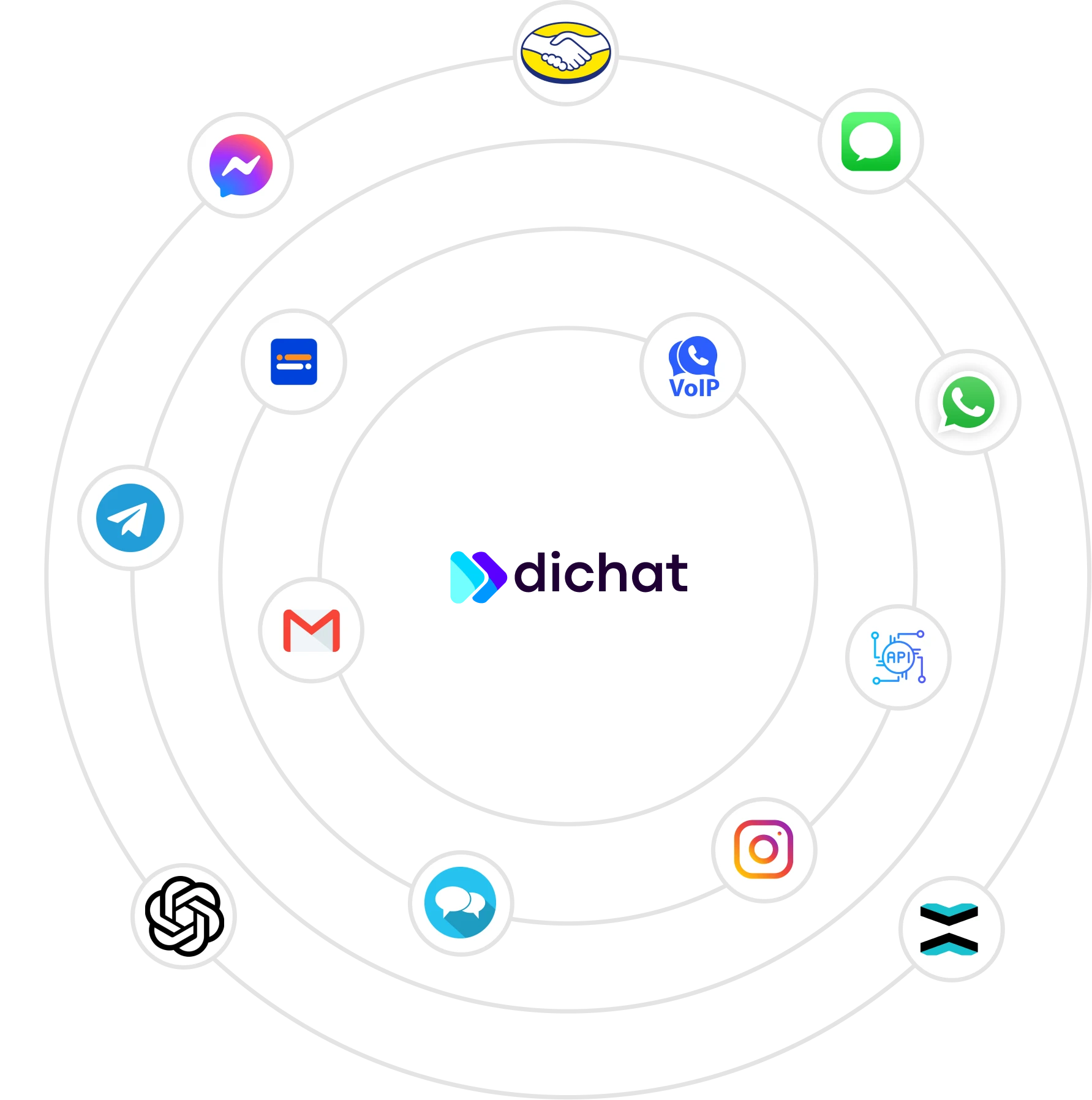 O Dichat é uma plataforma completa de atendimento ao cliente, integrando canais como WhatsApp, Instagram, Facebook, Telegram, Mercado Livre, Webchat e entre outros canais.